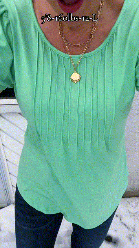 This t-shirt fits flowy and comfortably, the pleating design helps contour the chest area and conceal tummy issues, the puff sleeves hide big arms nicely. The curved hem adds a stylish touch, long enough to cover the rear, making it perfect to wear with leggings.